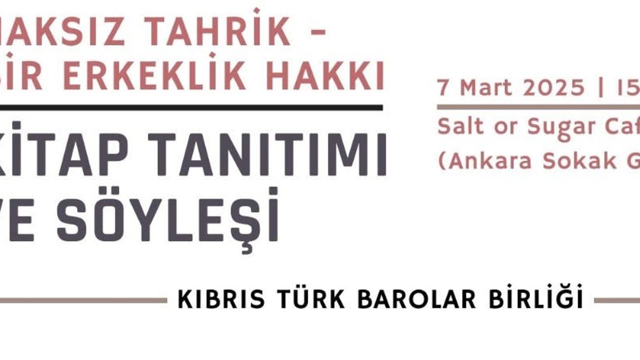 Kıbrıs Türk Barolar Birliği, 8 Mart Dünya Kadınlar Günü kapsamında Doç. Dr. Eylem Ümit Atılgan’ın “Haksız Tahrik – Bir Erkeklik Hakkı” adlı kitabını tanıtacağı bir etkinlik düzenliyor.