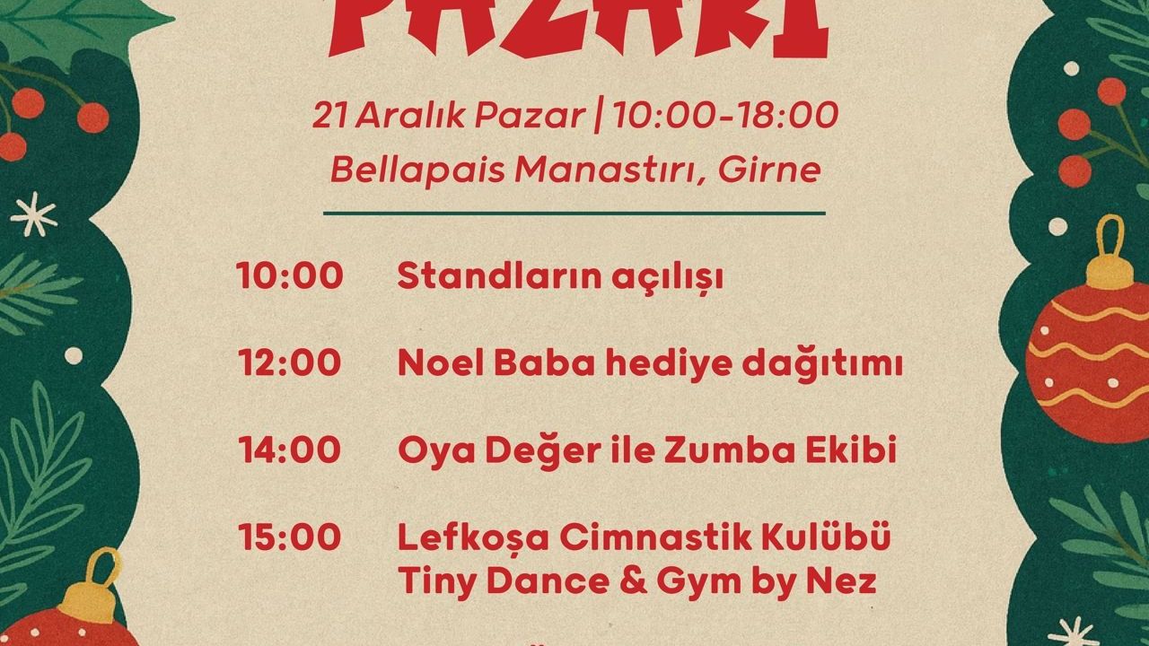 Noel Baba'nın hediye dağıtacağı etkinlikte, Oya Değer ile Zumba Ekibi, Lefkoşa Cimnastik Kulübü Tiny Dance & Gym by Nez performans sergileyecek. Etkinlik, 16:30’da Boran Özpınar’ın akustik dinletisi ile devam edecek.