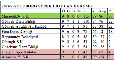 Tuborg Darts Süper Lig’inde ikinci yarının ilk maçları dün (Pazartesi) akşam oynanan çekişmeli maçların ardından sona erdi. Namağlup lider konumunda olan Minareliköy Spor Kulübü’nün evinde Cihangir Spor kulübü ile karşılaştığı gecede seyir zevki yüksek bolca 180’in atıldığı karşılaşmadan 12-4 galip gelen Minareliköy Spor Kulübü liderlik koltuğunda oturmaya devam etti.