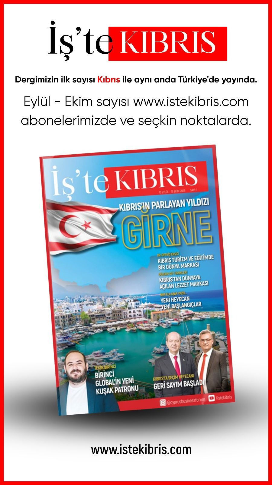 Daha önce “Big North Cyprus” projesi kapsamında, www.istekibris.com adresinde iş ve dijital haber platformu olarak yayın yapan İş’te Kıbrıs, artık basılı dergi formatıyla Kıbrıs’ın iş ve yaşam dünyasına ışık tutacak.