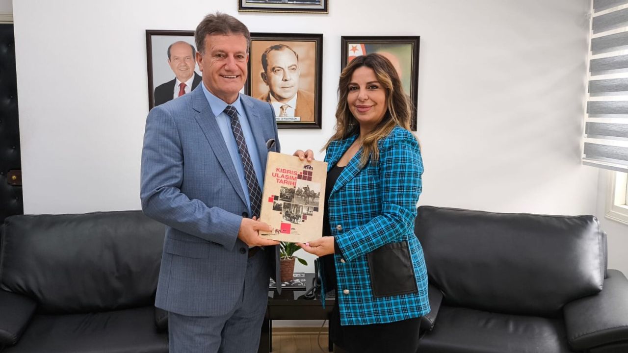 Bayındırlık ve Ulaştırma Bakanı Erhan Arıklı, “Kıbrıs Ulaşım Tarihi” kitabının yazarlarından Hatice Özer Şahin’i kabul etti.