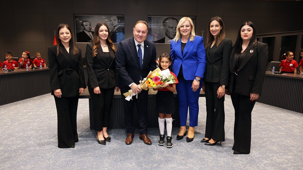 Cumhuriyet Meclisi Başkanı Ziya Öztürkler, Güzelyurt Barış İlkokulu Müdürü Filiz Ustam ile öğrencileri kabul etti.
